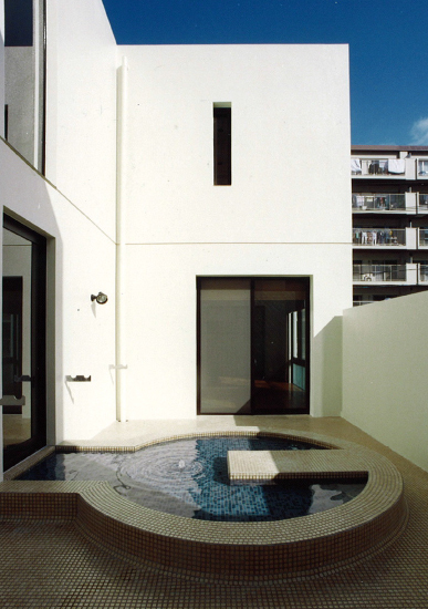 外観は単純明快な直方体で、ファサードもシンメトリーというシンプルさ。側面のエッジ型のガラスでアクセントをつけながらも、多くをコンクリートの外壁が内部を覆っている。さらに外壁は白色のペイント仕上げ。(中略)しかし、ファサード中央のエントランス階段を上がり、2階へ着くと状況は一変する。外観からはわからなかったが、屋上をすりばち状にくり抜く形で、建物内部に円形の池が設置されている。一見してこの池がシンボライズされた存在であることに気づく。ある種ストイックで無機質にも見える外観のキューブ(箱)に囲まれた水をたたえる池は、キューブとは究極的に対比する要素であり、有機体が持つ両性具有を意味している。外部を拒絶するような外観を有しながら、エントランス階段を駆け上がると、内部では水面に太陽の光を反射する池が、安らぎをあたえてくれる。(松永英己氏評)